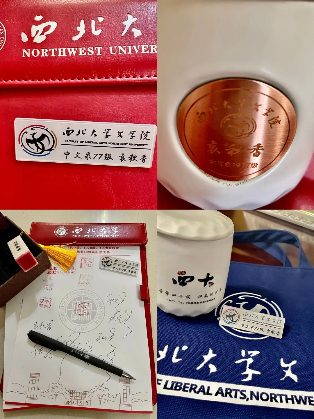 我们有的,母校给我们存着。我们没有的,母校给我们补上。比如无论级别齿序,都有一枚雕刻着“公诚勤朴”校训和名字的蓝田玉章;比如将名字镶嵌在紫金卡上的白瓷纪念杯;比如当年来不及恢复的拨穗礼;比如设计精巧的写着院系级别姓名的新校徽……母校让我们回到40年前,我们却看到了母校120岁的生命力。