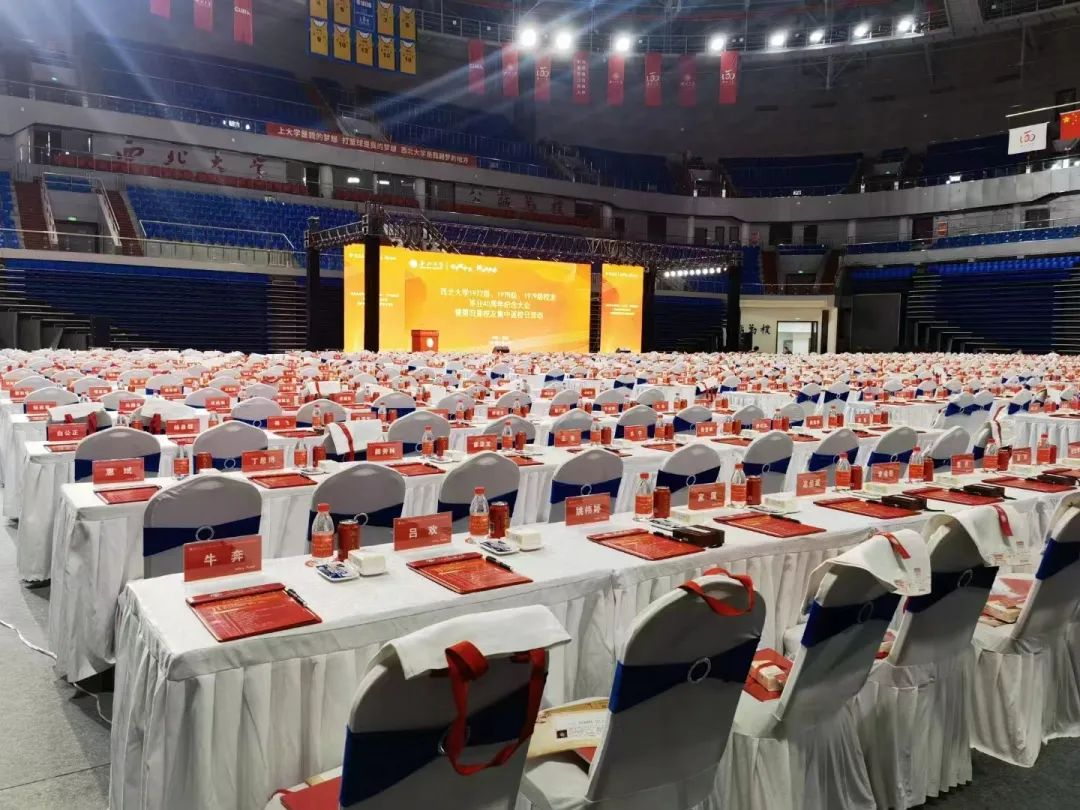 开始因为身体原因我想迟到一会,一看群里发的现场照片就不敢吱声了。承办过第十四届全运会项目的校体育馆已经盛装起来,灯火辉煌,宏大肃穆,像一艘即将启航的豪华邮轮。雪白的桌衣上800多人的红色桌椅一字排开,椅子上放着量身定制的T恤,大大小小的文件夹、会议流程、全体返校生花名册、一把雨伞、一支签名笔、连便签都是精制的。母校这是动员了多少人、付出了怎样的代价啊!