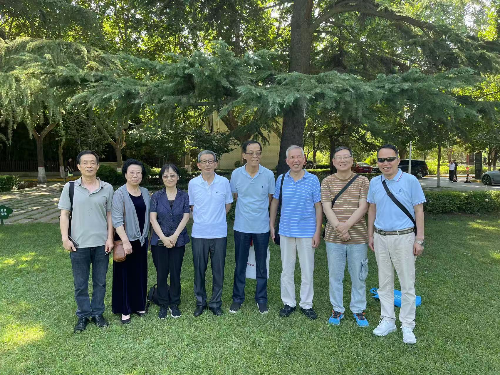 77级校友返校时,在中心草坪和雪松前合影