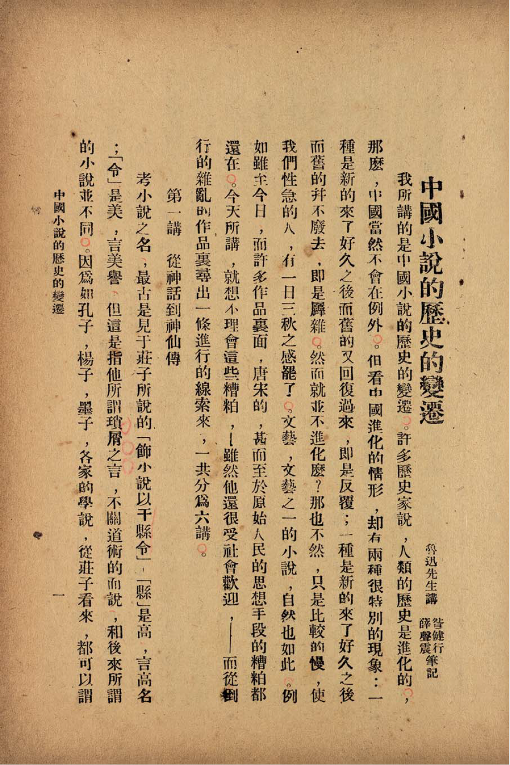《中国小说的历史的变迁》 鲁迅先生讲;咎健行、薛声震笔记