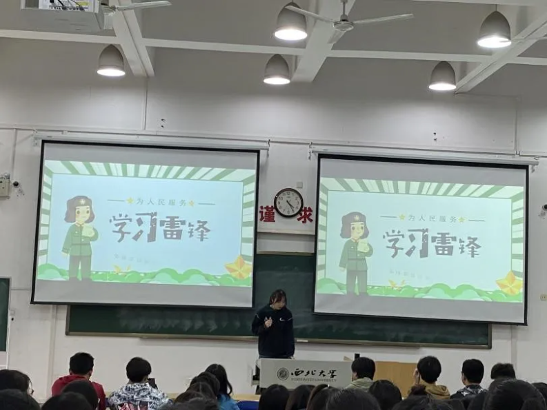 “正值“学雷锋月”,我们班开展了“讲好雷锋故事,传承雷锋精神”的主题团日活动,团支书通过多媒体展示的方式向我们讲述了雷锋同志的生平,我对雷锋精神有了进一步的深刻了解和感悟。我们都希望以雷锋同志作为榜样,将雷锋精神内化于心外化于行,在生活中做到自立自强、与人为善;在学习中做到认真实干、不懈努力,在全班形成“我为人人,人人为我”的良好风尚,争做一名有理想、有本领、有担当的大学生。”