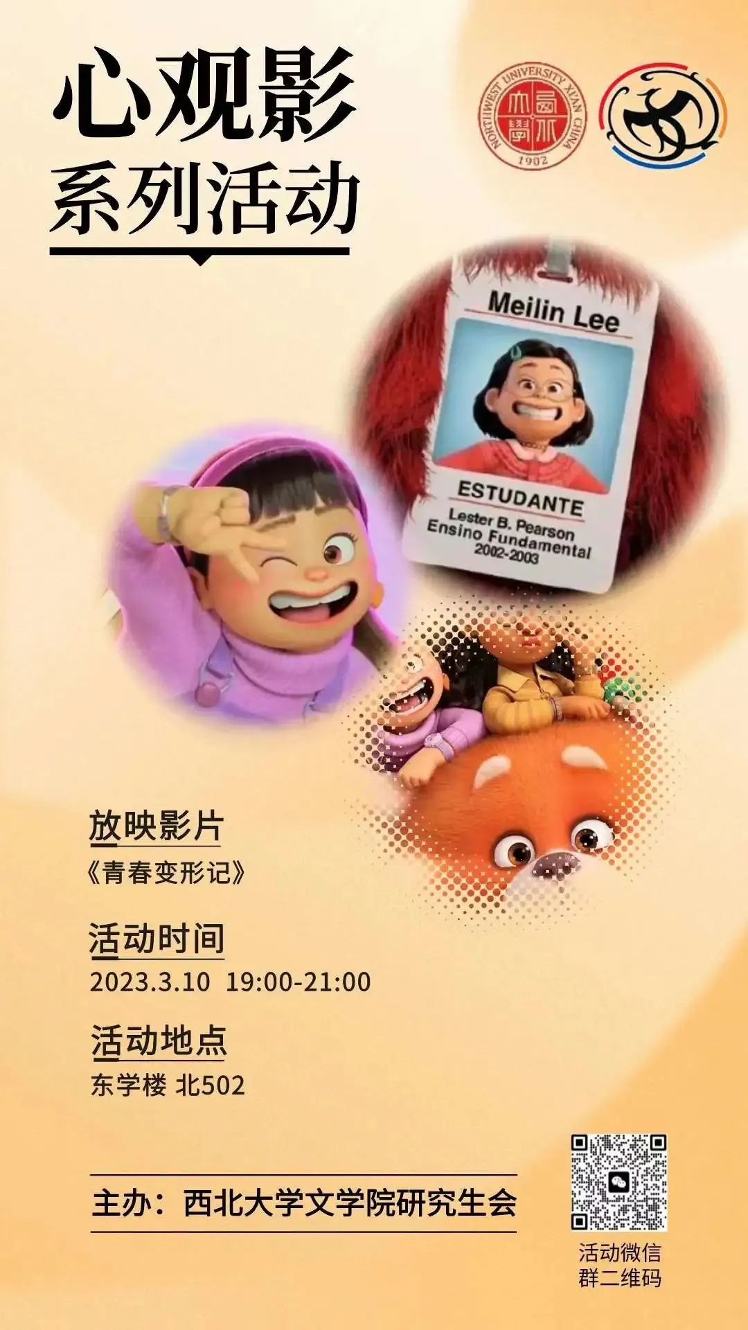 本次放映的影片是动画电影《青春变形记》。主人公李美琳是一名正值青春期的华裔女孩,继承了家族“变身”强大野兽的天赋,在其兴奋或压力过大时,会变成一只巨型红色小熊猫。小熊猫象征着青春中的个体生命变形物,揭示着成长必经的肉体与灵魂蜕化。李美琳在青春成长过程中不断剖析自我,最终获得自我认同、确认自我主体,向我们展示了个体生命经历青春的迷茫困惑后,不断找寻自我与人生意义的过程。影片构思精巧,刻画细腻,人物设定生动形象,以趣味诙谐的动画引发了同学们关于自我认同的深刻思考。